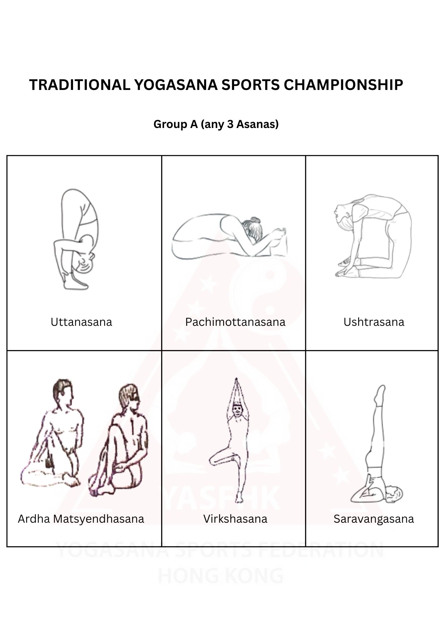 Number of postures/formations performed should be 10 asanas of competitor’s choice. Among these 10 postures/formations: