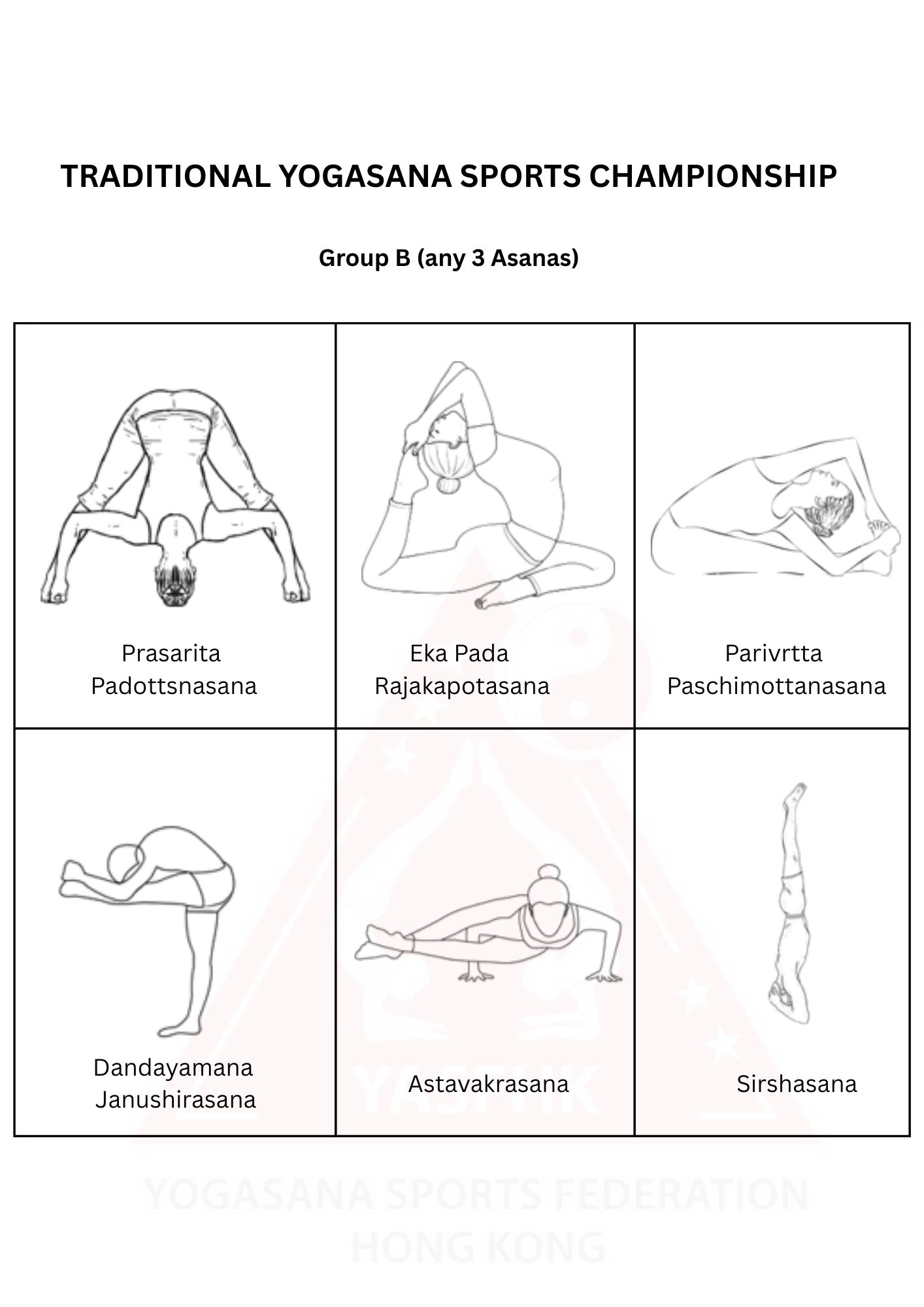 Competitors can change the sequence but must perform all categories. Missing any category = no marks for that asana and penalty of 2 marks per missing category. Pyramidal formation is allowed up to 2 layers.